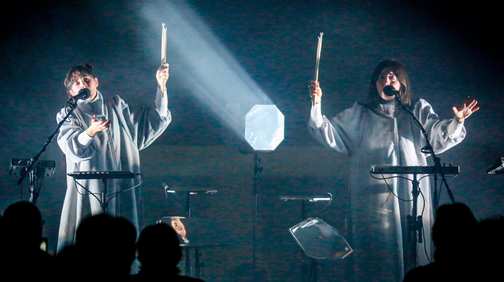 Després d’uns instants de suspens a causa d’un inconvenient tècnic començà l’audició dels onze variats temes que inclou el disc, en què aquest reconegut duo —premi Enderrock de la crítica (2019) i premi Ciutat de Barcelona de música (2022)—, s’inspirà en una bona colla de motius, ja que van des d’uns versicles de l’Apocalipsi a cançons tradicionals. Les seves veus conjuntades perfectament anaren desgranant el repertori amb una gran riquesa idiomàtica, ja que cantaren en català, castellà, llatí, italià i jueu espanyol. Les seves interpretacions “a cappella” les acompanyaven amb els sons de sofisticats instruments electrònics, el maneig dels quals també anava a càrrec seu, i d’una escenografia fonamentava en uns flaixos de llums –potents i intermitents– que travessaven una fumera espessa que omplia el presbiteri, en què emergien les esveltes figures d’ambdues cantants, que, per cert, lluïen una indumentària –tant solemne com intemporal–, i que ressaltava sobre el fons format pels carreus mil·lenaris del temple, sense vida però amb molta història contemplada.